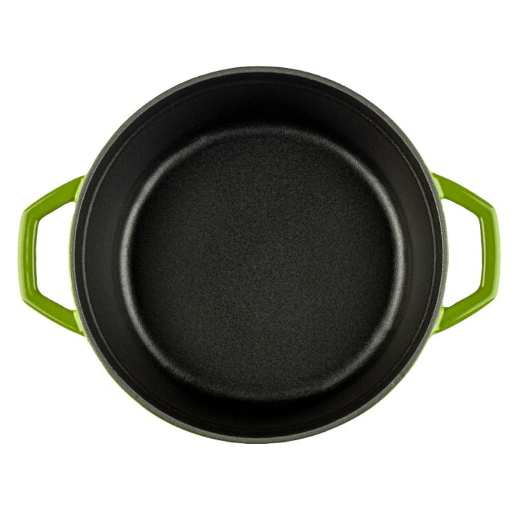 - Esmaltado interior y exterior verde manzana: Superficie antiadherente natural que no requiere curado, fácil de limpiar y resistente a óxido