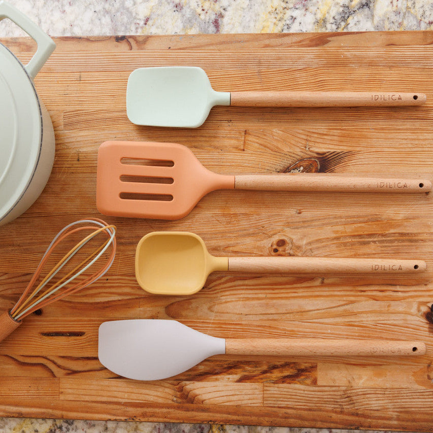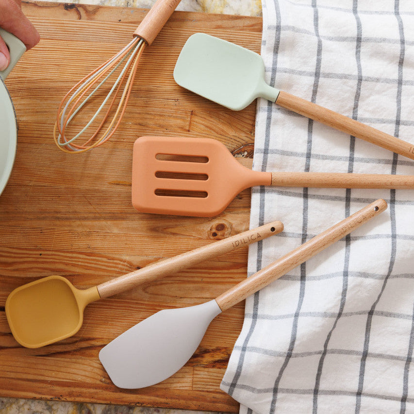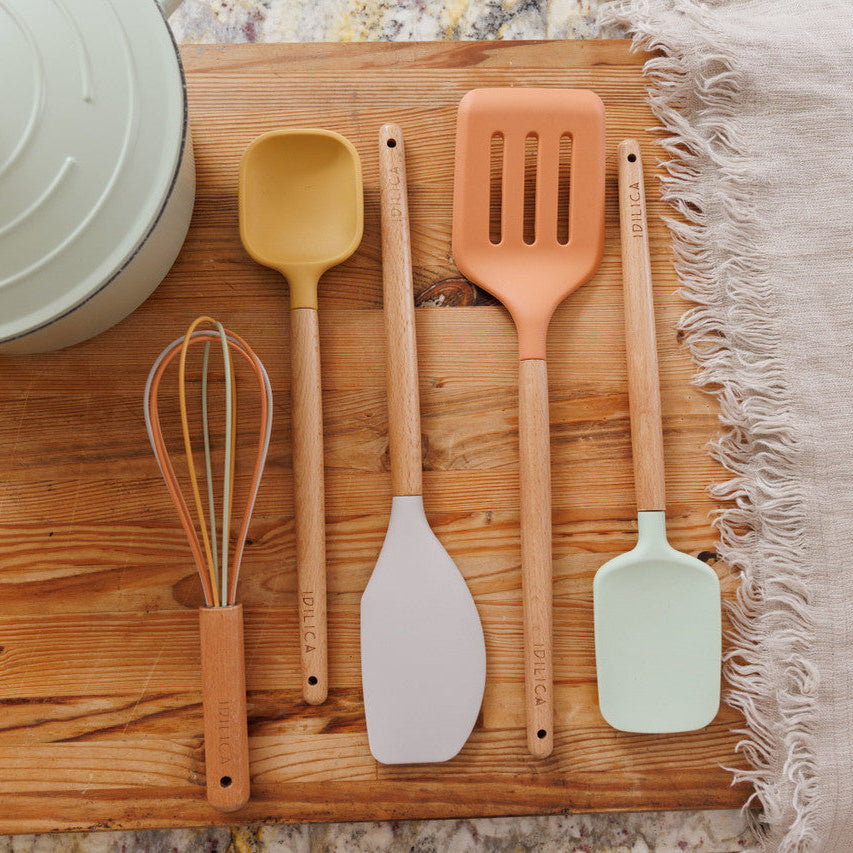 Equipa tu cocina con el Juego de 5 Utensilios de Silicona KitchenCraft Idilica. Silicona LFGB, madera de haya FSC, resistencia hasta 260°C y diseño colorido para cocinar con alegría y profesionalidad.