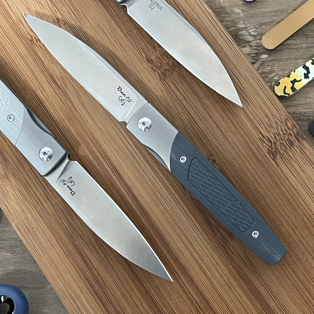 Navaja Salamandra One Valeria fabricada en hoja de acero D2 con acabado satinado. Sistema de bloqueo de la hoja mediante Linerlock.