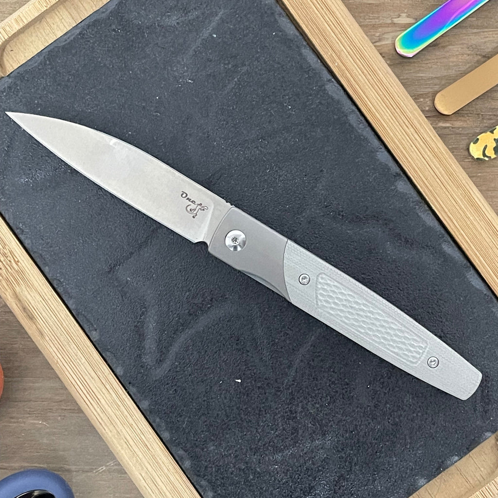 Navaja de Albacete auténtica que combina tradición y modernidad. Con apenas 74 gramos, destaca por su ligereza sin comprometer resistencia. La hoja de acero de 8,5 cm ofrece precisión en cada corte, mientras que la virola de titanio garantiza durabilidad extrema. Las cachas en G10 proporcionan agarre seguro y ergonómico, incluso en condiciones húmedas. Diseño compacto ideal para uso diario, viajes o colección. Una herramienta versátil que refleja la excelencia artesanal de Albacete.