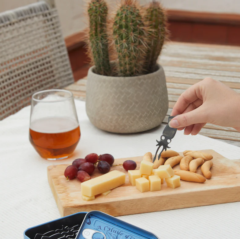 Tenedores para aperitivos Conserverie Calamares Sorprende a tus invitados con estos originales tenedores inspirados en calamares, diseñados para disfrutar de bocados con estilo y diversión. Cada pieza combina funcionalidad con un toque fantástico que elevará cualquier reunión. Presentados en un empaque ingenioso que imita una lata de calamares, estos tenedores son el detalle perfecto para anfitriones que desean dejar una impresión memorable. Ideales para aperitivos, tapas y momentos de convivencia donde la creatividad y el buen gusto se encuentran.